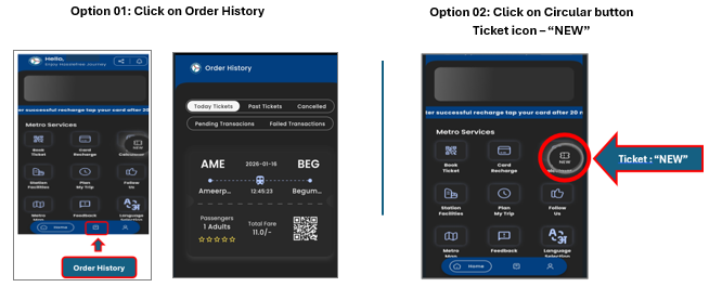 You can view your QR ticket either by clicking on “Orders History” available on home page at the bottom or by clicking on the circular button with “Ticket icon” named as “NEW” displayed on your present page of APP as shown below.